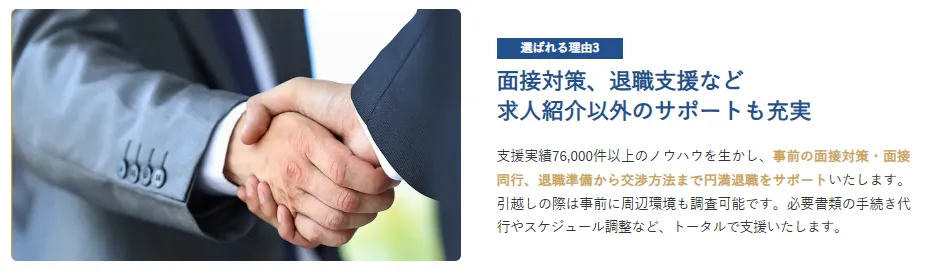 これまでの支援実績は76,000以上であり、実績から培ったノウハウを活かし、面接対策から入社前の条件交渉まで一貫してフォローしてくれますよ。