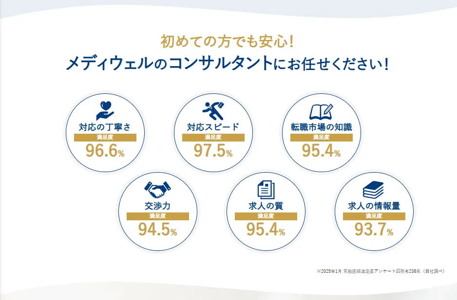医師転職ドットコムが評価されている主な項目は、以下のとおりです。